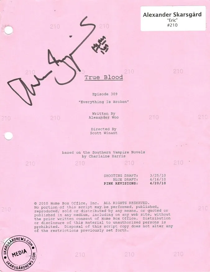 The scripts have been sent directly from Alex to skarsgardnews.com so there are no copies floating around. Below is a picture Alex took of himself holding the various scripts that have been up for auction before they were sent out.