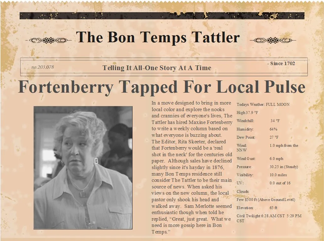 Well it’s about time someone wanted to hear someone with a lick of sense! I would like to first thank the Bon Temps Tattler for requesting my services as a bonafide reporter of this fine paper. And I give my word that I will report the strange happenings of our town to the best of my abilities and I will tell the truth and as the Good Lord says, “The truth will set you free!”