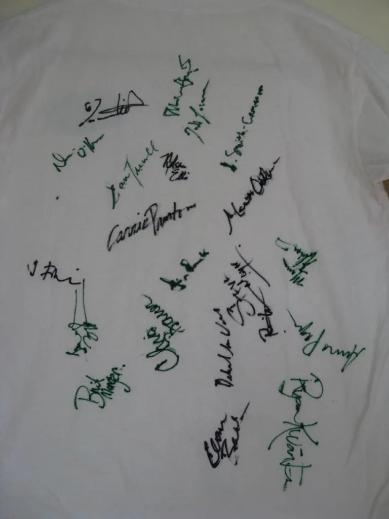 Carrie Preston has done it again! In order to help her nephew support his school, she got the cast of True Blood to sign a Merlotte‘s shirt that has been put up for auction to raise funds for her nephew’s school. The shirt has all the autographs on the back, and includes signatures from pretty much everyone, including Anna Paquin, Stephen Moyer, Ryan Kwanten, Rutina Wesley, the new cast members from Season 3 of True Blood, and of course Alan Ball and Carrie herself.