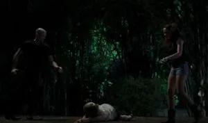 Last week we were left high and dry with a cliff hanger. The episode throws you back to where the last episode left us; it’s at full pace from the start. The Rattrays are beating Sookie, to within inches of her life, and the mysterious dog from the first episode reappears trying to distract the Rattrays, but one of them pulls a gun on the dog. Sookie makes a grab for the gunman, but something throws him up into the air and against the trees and slits his throat, closely followed by the remaining Rattray. You kinda guess that they are both dead.