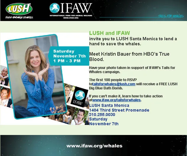 This event gives True Blood fans a great opportunity to see Kristin and get an autographed picture! Even if you are unable to go, you can still make your voice heard for the whales by uploading your picture to the Tails for Whales website. Another thing that would help would be to purchase the LUSH cream Kristin mentions. LUSH is a generous supporter of the IFAW effort, and proceeds earned from their “Charity Pot” products become contributions to IFAW’s marine mammal programs like the Tails for Whales campaign.