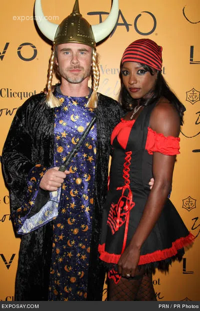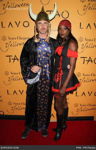 Over the weekend True Blood fans had the chance to party with Sam Trammell (Sam Merlotte) and Rutina Wesley (Tara Thornton) at the Veuve Clicquot’s Yelloween party at the Lavo nightclub inside the Palazzo Hotel and Casino on October 31, 2009 in Las Vegas, Nevada. Sam‘s costume was probably best described as a “Viking Sorcerer”, wearing a horned viking helmet with long blonde braids, a wizard’s robe and wand. Rutina on the other hand, was dressed in a black and red pirate outfit. Both True Blood stars mingled with guest at the Halloween bash which probably had its fair share of vampires roaming around.