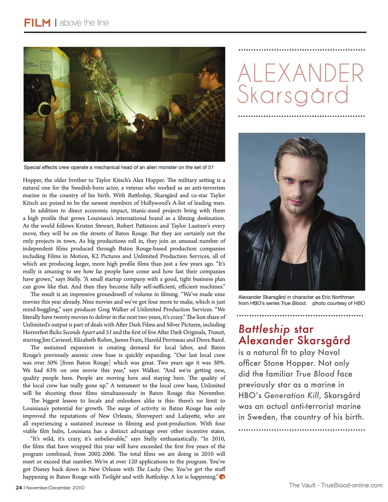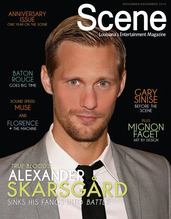 As one of the stars of the action sci-fi film, ‘Battleship,’ (Release date: May 18, 2012) True Blood’s Alexander Skarsgård is on the cover of Louisiana’s Entertainment Magazine – Scene Magazine’s November-December issue. Filming of the might-be blockbuster took place in part in Louisiana which most fortunately is experiencing a surge in productions being made there.