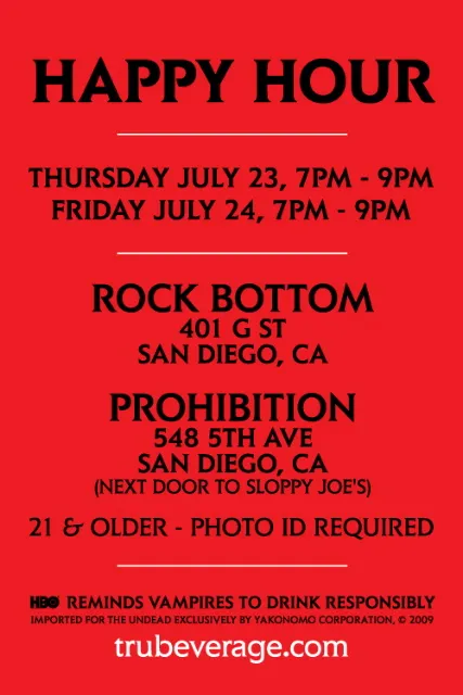 HBO through it’s Trubeverage.com site will be sponsoring 3 separate ‘Happy Hours’ at three different locations over the course of this weekend’s Comic-con 2009. Thursday and Friday, July 23-24, 7-9 pm (so that’s really 2 hours of happy!) at two local establishments, Rock Bottom and Prohibition, those over the age of 21 can mingle with fellow True Blood fans.