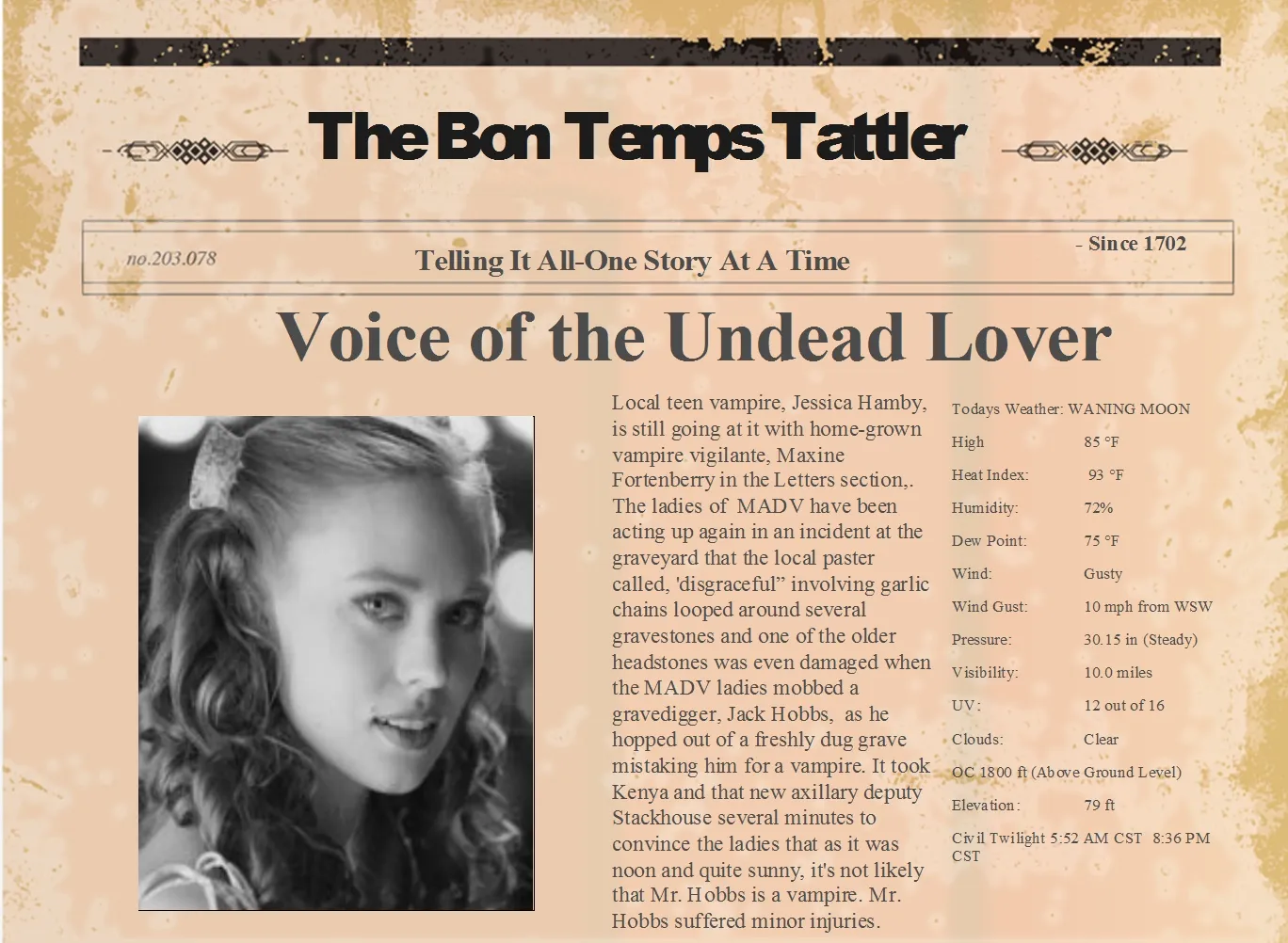 For a small fortune (and the promise of a steady supply of medicinal quality V) TrueBloodNet.com has gotten Dr. L to agree to answer your supernatural medical questions. Ask Dr. L is written by Dr. L (any resemblance to any characters living, dead or undead is purely coincidental), also known as Doctor to the Supernaturals, and was founded by her mother, Philine Paullips. It is the most popular and widely syndicated supernatural medical advice column in this world — or any other. Known for its uncommon nonsense and immortal, or just darn old, perspective.