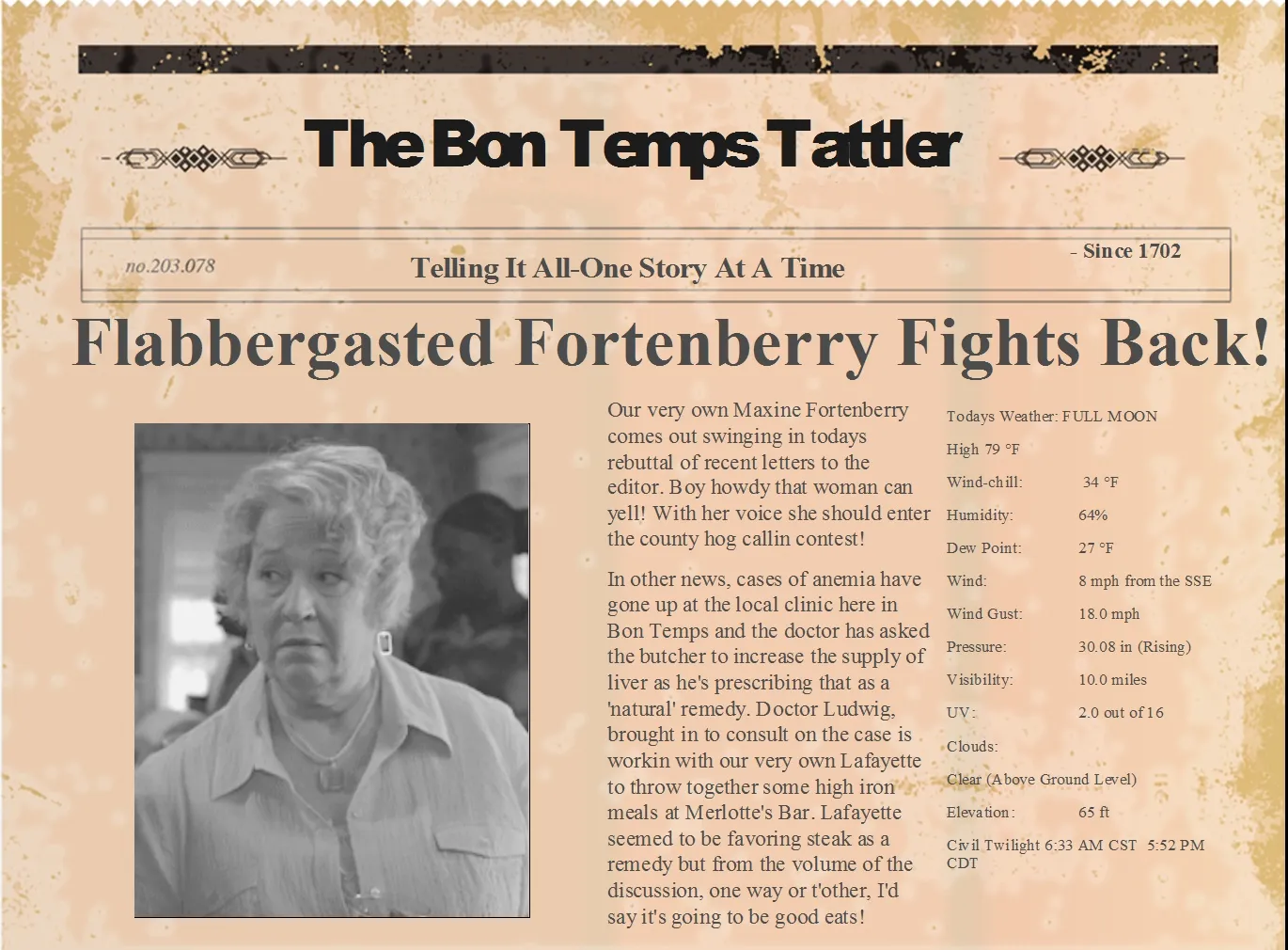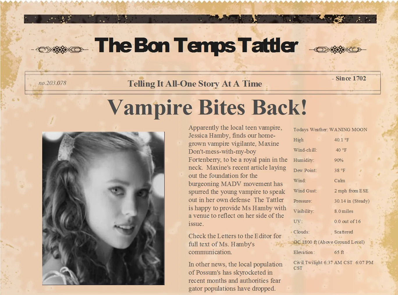 BILL: You’re very welcome, Miss….uh, I’m sorry but I do not know your name. I would hardly call us a couple, far from it, as far as I am concerned. Lorena is my Maker. That is the only connection I have to her. As for why we chose The Bon Temps Tattler and yourself, that will have to remain Lorena and my little secret, but you will be sure to see to it that Truebloodnet receives it’s copy of the Tattler?…It is my understanding that I have many admirers there [Flashes a charming smile, noticing her Sparkly “TEAM BILL” baby tee] And by the way, I do not sparkle in the sunlight.