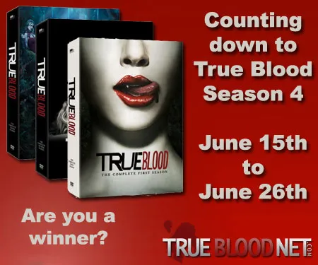 Ok True Blood Fans it’s count down for True Blood Season Three airing Sunday, June 13. TrueBloodNet.com will be running several contests weekly where you can have a chance to win TruBlood Drinks, Gift Cards, True Blood Season 1 and 2 DVD Sets, Soundtracks, T-Shirts, Posters, General True Blood Fan Gear, Sookie Stackhouse Box Sets and much more!