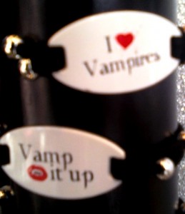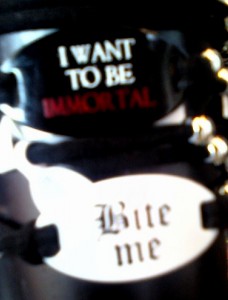 Greetings all dark hearted and dark curious lovelies. Though the current popularity of the vamp milieu and True Blood is no secret I still find myself amused at some the forms in which it appears. These bracelets were a somewhat isolated item in a rather kitschy ‘attraction’ store: