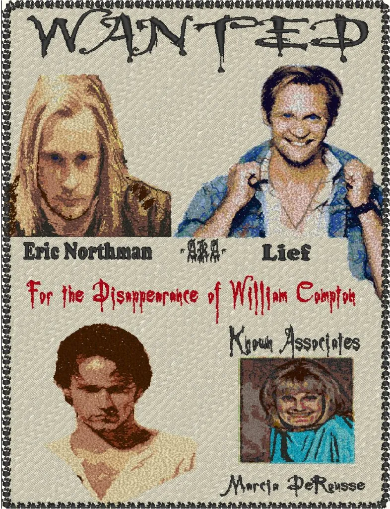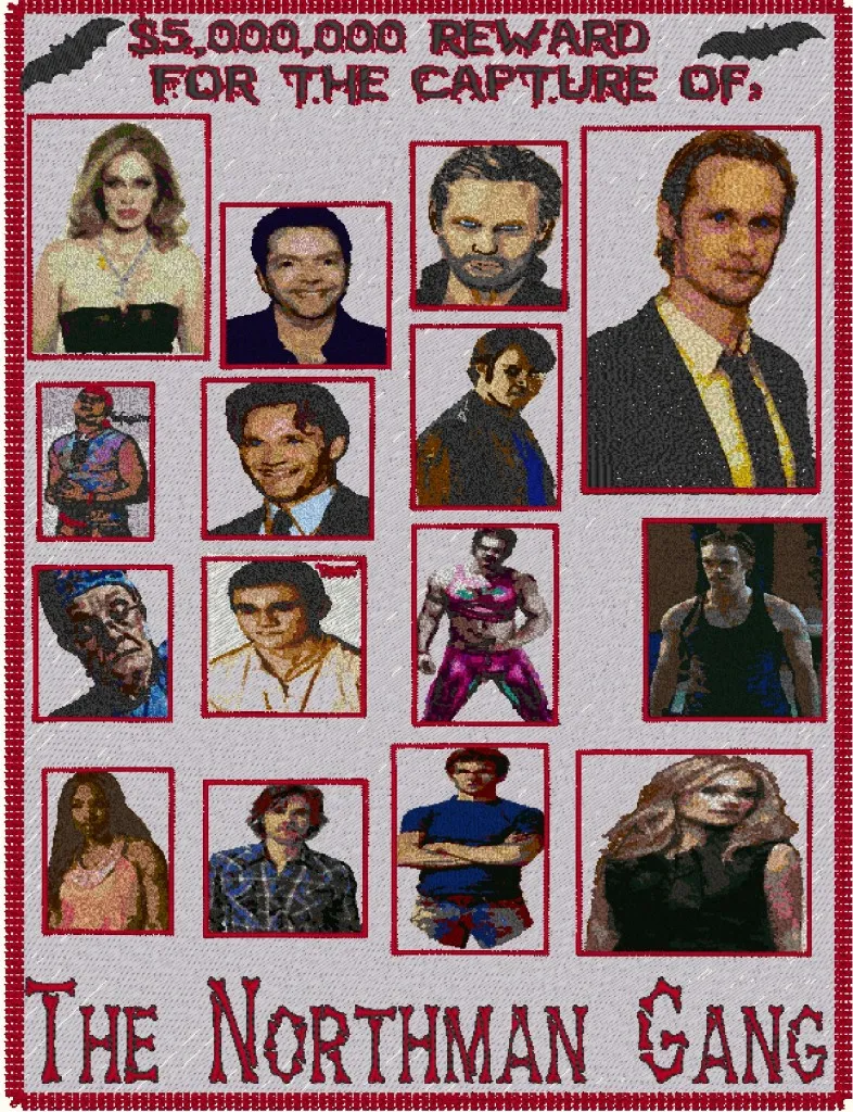 True Blood viewers have also been known to make some really creative fan art. We heard about one woman in particular named Lorrie Krause who does True Blood-themed embroidery. She uses a software program that takes pictures of the actors and creates a basic outline. She then sits down and does all the stitches by hand. She can make anything from patches to t-shirts. The pictures below of her “Northman Gang” and “Wanted: Eric” projects were entries in a Facebook contest. Each of them took a couple of days to complete because the composite is pretty big with each individual picture measuring about 7×10 cm. Not surprisingly, people were impressed by her creations, and “Wanted: Eric” was voted as the favorite.