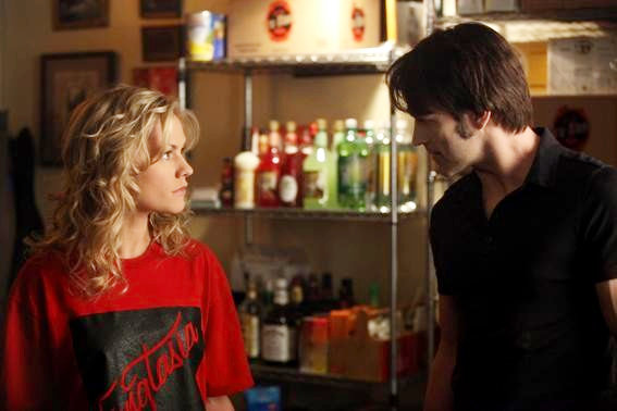 Jessica also wakes up alone…and gets herself dolled up…strolling into Merlotte‘s, looking mighty fine with the song, “Sex andA?CAndy” playing in the background. Cupid’s Arrow heads straight for Hoyt (the adorable Jim Parrack) and he asks if he can sit withA?her. One thing leads to another (and let me just say, that Hoyt is so darn cute and sweetA?you just want to eat him right up. Yum.) and after some hilarious banter about chicken fried steak, he discovers that Jessica is a vampire. She has been sneaking a few peeks at the vein throbbing in his neck, but otherwise, she seems pretty shy and she has the most beautiful smile. Hoyt sure thinks so too…telling her that he could stare at her smile all day. Jessica is a bit stressed out by mentions or daytime and food…but Hoyt finds theA?fact that she is a vampire, “Awesome”.